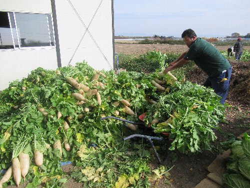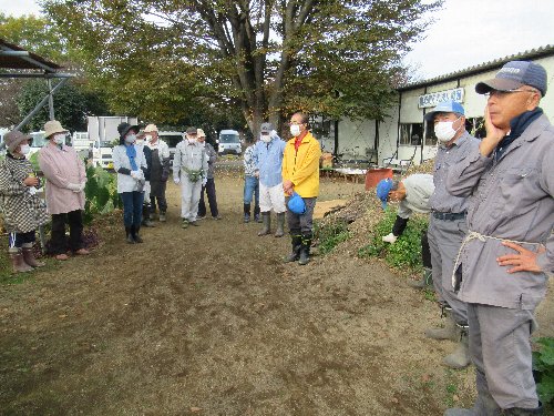 | 大根他の収穫作業について 令和4年11月13日(日)AM9:00より 収穫実施の時は、役員・会員の皆様お忙しいと存じますが、ご協力のほどよろしくお願いいたします。 大根のほか何が収穫できるかな ![]() ■R4/11/13 9:00-晴天に恵まれました。松村会長のあいさつと実行委員長の作業説明(参加者44名) ![]() ■白菜の収穫仕分け ■大根の収穫仕分け ■里芋の収穫仕分け(栽培は今年で終了との事、種芋保存は無くなりました) ■ネギの収穫仕分け ■ナスの撤去作業 ■白菜大根の収穫後の全景 ■収穫野菜の配布(白菜大根は6本/人、里芋とねぎは1袋/人、京芋(筍芋22袋)はジャンケンで、 大変な量の配布でしたので、車へ行ったり来たりして、お持ち帰り頂きました |
