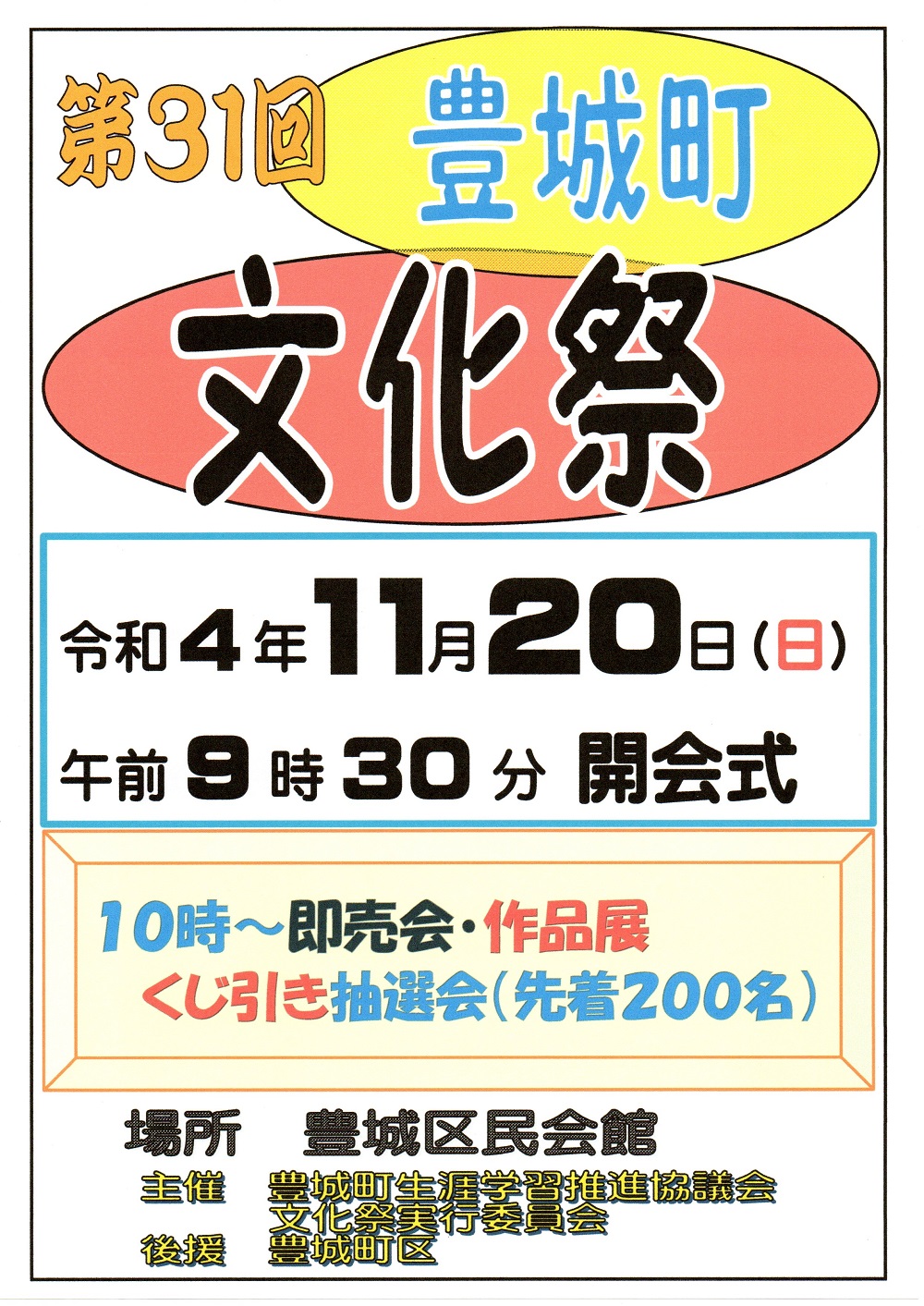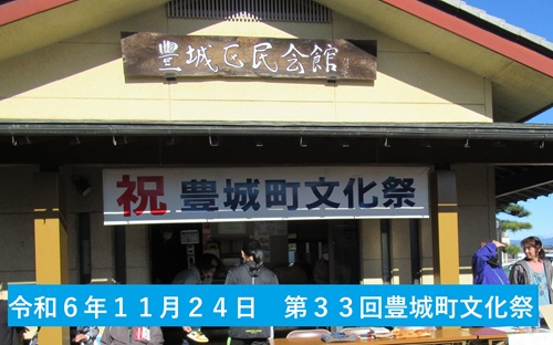 | 令和元年度(第30回) 豊城町文化祭の開催と準備 開催日11月17日(日) 準備8時30分~・開場10時 ■実行委員代表者会議 9月28日(土)午後6時30分~ 区民会館 ■実行委員会 10月27日(日)午後6時30分~ 区民会館 ■準備 展示準備は前日の午後1時~ 会場作り・作品の展示 ■開催日 8時30分~準備、10時開場 野菜即売会、出展展示、 12時~芸能発表、式典・抽選会 ■懇親会(抽選会終了後) |