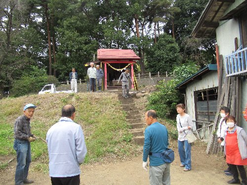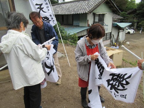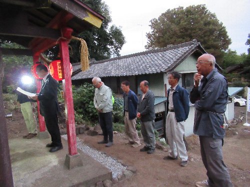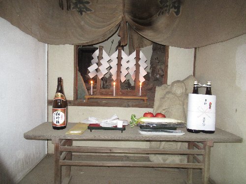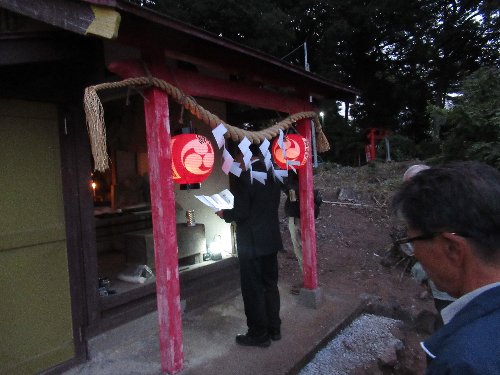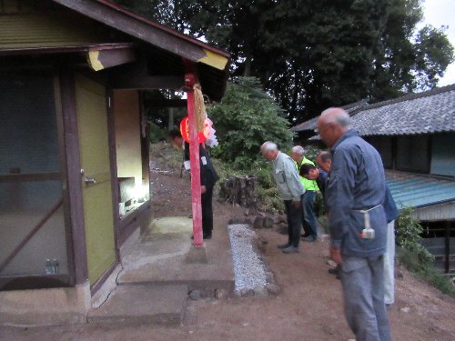 ■R5 PM3:00〜多聞天祭の準備作業を見てきました(参道が荒れているため、R5から参拝入り口は、南からに参拝して頂くよう変更しました) ![]() ■旧しめ縄を撤去し、新しめ縄に交換する作業と清掃作業。また、参道変更のため、灯篭の設置はR5は、省略しました ![]() ![]() ■R5 しめ縄も更新されました ![]() ■R5 階段下の迎門が老朽化した為、R4〜「五穀豊穣」と「多聞天祭」の、ノボリ旗に変更、旗の準備作業 ![]() ![]() ■幣束と灯り・米・塩・水・果物さらに三種の生饌(せいせん)を飾り ![]() ■PM4:00- 準備完了 ![]() ■PM5:00- 区長の祝詞で式典・区役員と農事役員によるお清め ![]() |